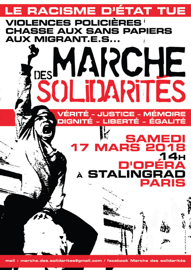 Contre les violences policières, la chasse aux Migrant-e-s et aux Sans-Papiers et le racisme d'Etat, les collectifs des familles victimes de violences policières, l'Assemblée des blessé-e-s, les collectifs de Sans-Papiers et Migrant-e-s, les résidents des foyers de travailleurs immigrés appellent à marcher à leurs côtés à Paris, le samedi 17 mars.