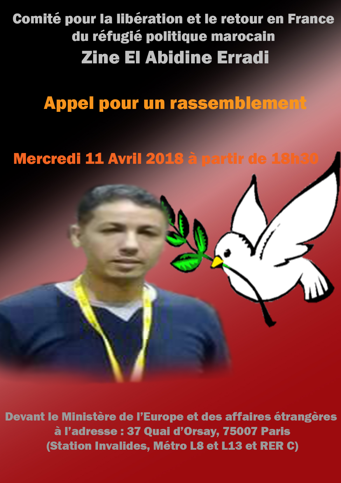 Un rassemblement pour la libération & le retour en France du réfugié politique marocain Zine-El-Abidine ERRADI devant le ministère de l’Europe et des affaires étrangères(37 Quai d'Orsay, 75007 Paris)