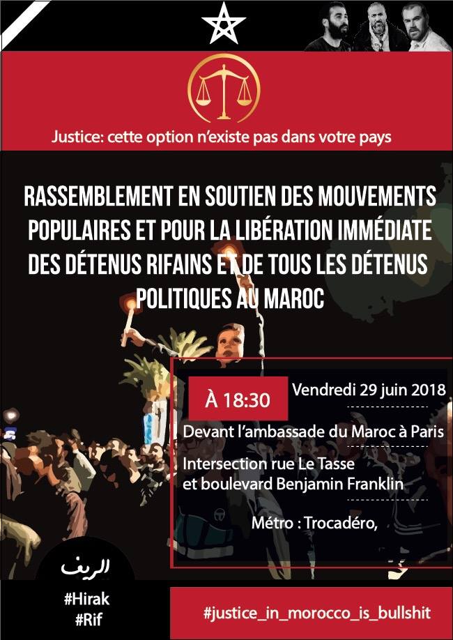 Le VENDREDI 29 juin à 18h30, devant l’ambassade du Maroc à Paris. Métro, Trocadéro (voir la vidéo)