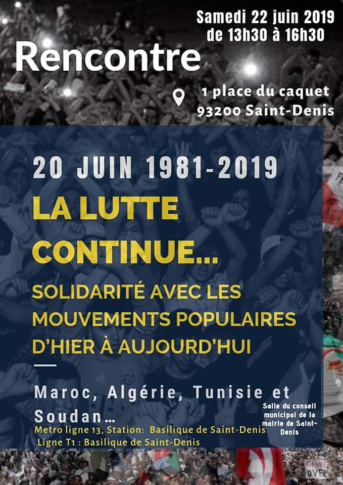 Lors de la rencontre de 3 mars 2019 à Saint-Denis entre les associations et organisations démocratiques marocaines en France, ASDHOM, AMF, ATMF, AMDH-Paris/IDF, TAMAYNUT-France, FMVJ-France, APADM, PSU-France, Voie Démocratique (Europe), PADS et FCSMR-France, d'organiser deux manifestations de solidarité :