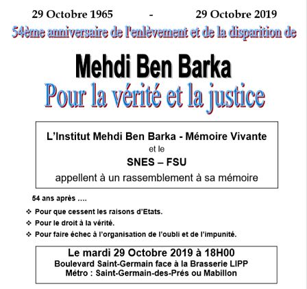 L'Institut Mehdi Ben Barka - Mémoire Vivante et le SNES - FSU appellent à un rassemblement à la mémoire de Mehdi Ben Barka.