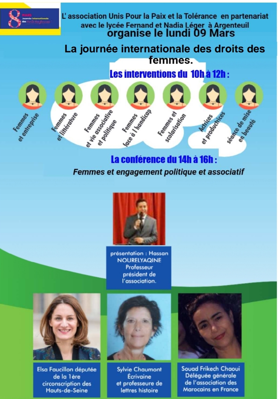 Dans le cadre de la journée internationale des droits des femmes l'association Unies pour la paix et la tolérance d'Argenteuil organise en partenariat avec le lycée Fernand et Nadia Leger une conférence débat le 9 mars sur le thème "Femmes et engagement politique et associatif".