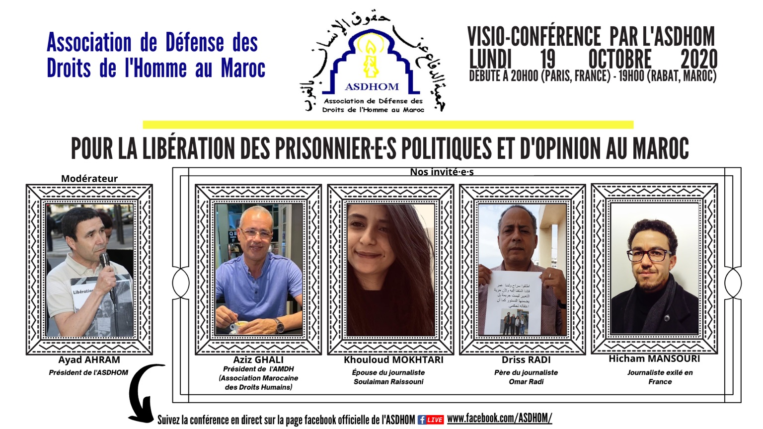 L’ASDHOM apporte son soutien indéfectible à tous les prisonniers politiques et d’opinion au Maroc. Elle envisage d’initier avec ses partenaires une campagne internationale pour réclamer leur libération. Et c’est dans ce cadre que s’inscrit la conférence numérique qu’elle compte organiser lundi 19 octobre.
