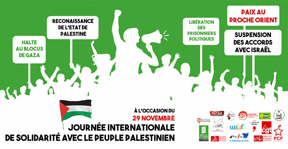 A l'occasion de la Journée internationale de solidarité avec le peuple palestinien, l'AFPS, la CGT, EELV, GDS, l'intergroupe parlementaire de la FI, le MJCF, la LDH, Le Mouvement de la Paix, le MRAP, le PCF, la plateforme des ONG françaises pour la Palestine, R&S, UAVJ, l'UNEF et l'UEC organisent un webmeeting en direct sur Zoom le lundi 30 novembre 2020 de 18h30 à 20h30.