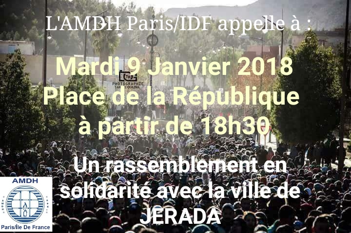 L’Association Marocaine des Droits Humains Paris/IDF appelle à un rassemblement de solidarité avec Hirak Jerada et autres régions du Maroc, le mardi 9 janvier à 18h30 à la place de la république, Paris